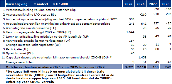 De uitkering van gemeentefonds is in de septembercirculaire 2025 verhoogd, voordeel voor 2025: € 3.221, 2026: € 2.118, 2027: € 158 en verlaagd, nadeel voor 2028 € 242. In onderstaand overzicht is de bijstelling septembercirculaire 2025 opgenomen. Uw raad is inmiddels via de raadsinformatiebrief over de septembercirculaire 2025 reeds geïnformeerd over de inhoudelijke bijstelling.