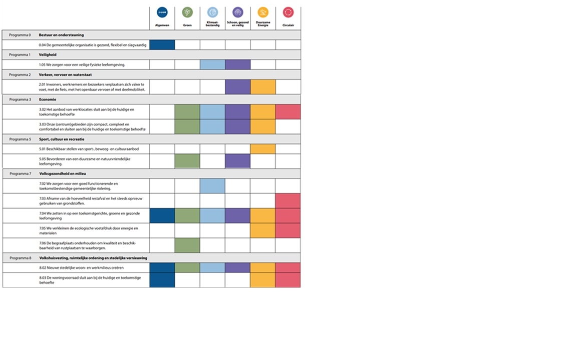 Terug naar navigatie - Brede welvaart - duurzaamheid - Borging en monitoringWe nemen jaarlijks nieuwe inzichten en aandachtspunten op en geven weer hoe duurzaamheid in de begrotingsprogramma’s is opgenomen. In onderstaande tabel is een weergave van de samenhang van de duurzaamheidsthema’s met verschillende begrotingsprogramma’s. Dit zal in 2026 verder uitgewerkt worden.
